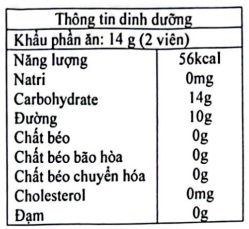 Thành phần: mạch nha, đường, hắc sâm cô đặc (Hàn Quốc) 0.1%, hương liệu tổng hợp (hương nhân sâm), chất nhũ hóa (INS 475), chất tạo màu tự nhiên (INS 150c), L-menthol